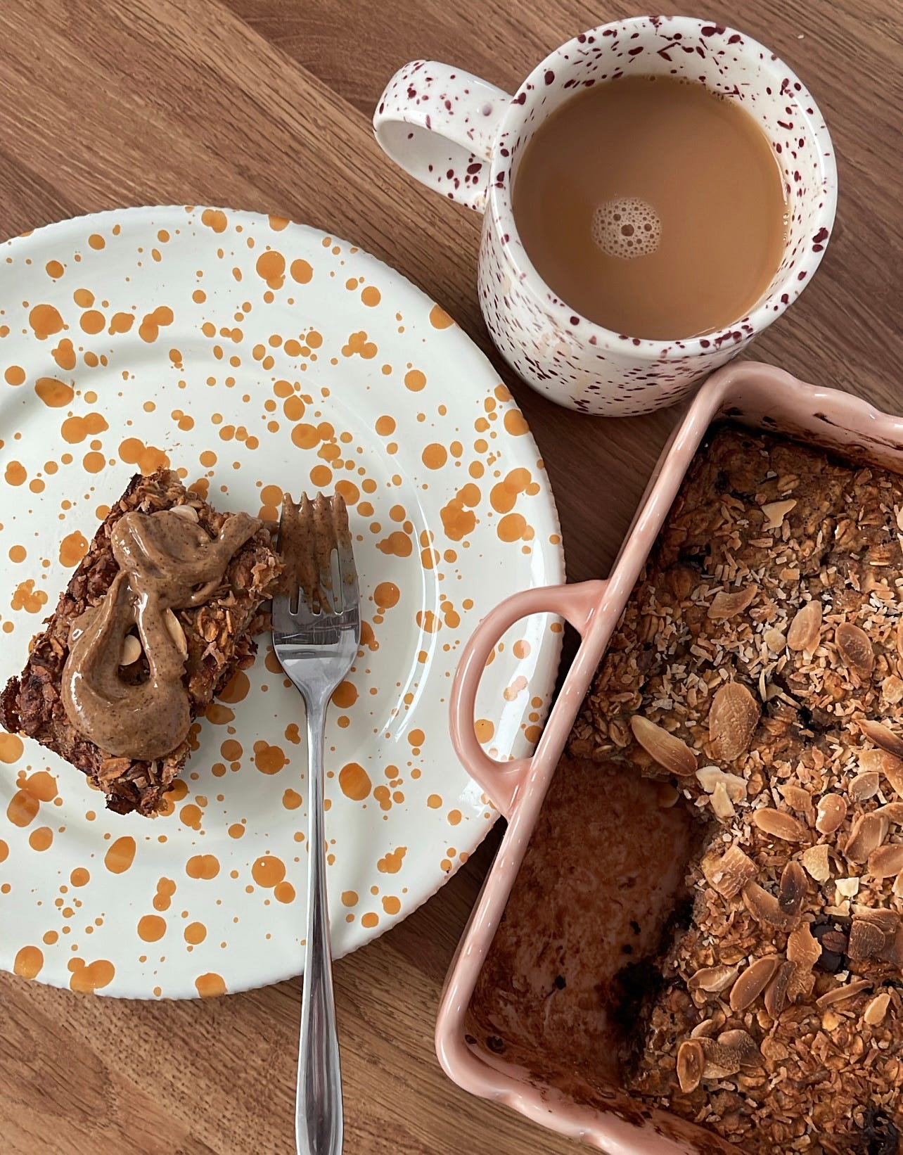 My favourite indulgence is serving a slice alongside a healthy dollop of the most luxurious Greek yogurt I can find. A generous spoonful of chocolate spread, or any nut/cashew/almond butter. I finish by topping with a handful of pomegranates, plus any other berries I have knocking about in the fridge.