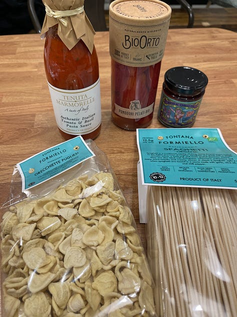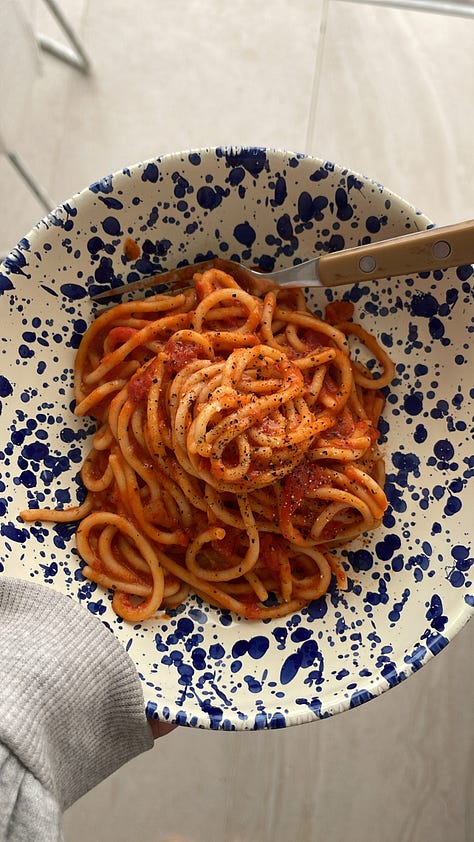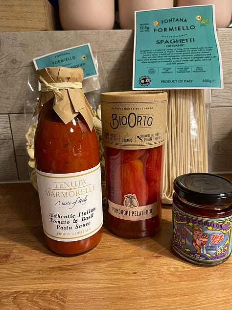 One of my favourite rituals is taking regular trips to my local indie food hall, and my favourite wholefood stores to gather ingredients. I rarely need a shopping list ~ these outings are like a treasure trove for my soul ~ I throw things into my basket guided by mood. Invariably drawn to the bougie pastas ~ a fancy spaghetti or orecchiette, and a jar of rich tomato-based sauce ~ usually tomato & basil, puttanesca, or roasted Italian vegetables. To compliment the sauce, I add a jar of premium cherry or plum tomatoes. And the finishing touch is always a good quality Italian Parmesan, and a freshly baked sourdough bloomer to mop it up with.